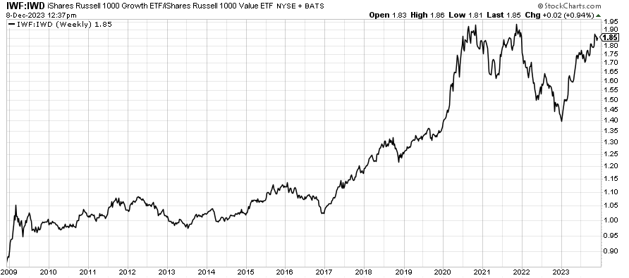 There’s no law of physics that says growth can’t continue beating value. Growth could get more expensive. Value could get cheaper. And liquidity (as long as it’s loose) will chase growth. That’s the bullish case for the indexes making new all-time highs either this year or early next.
