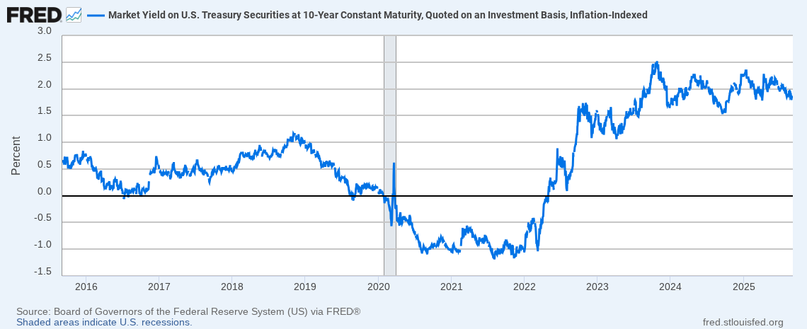 Real yields will decline in a stagflationary economy. The ‘real yield’ on a government bond is the nominal yield minus the ‘breakeven’ inflation rate (the market’s expectation for inflation over the next ten years). The Fed calls this the ‘Fisher equation.’ And right now it means real yields are falling while growth and employment are weak.