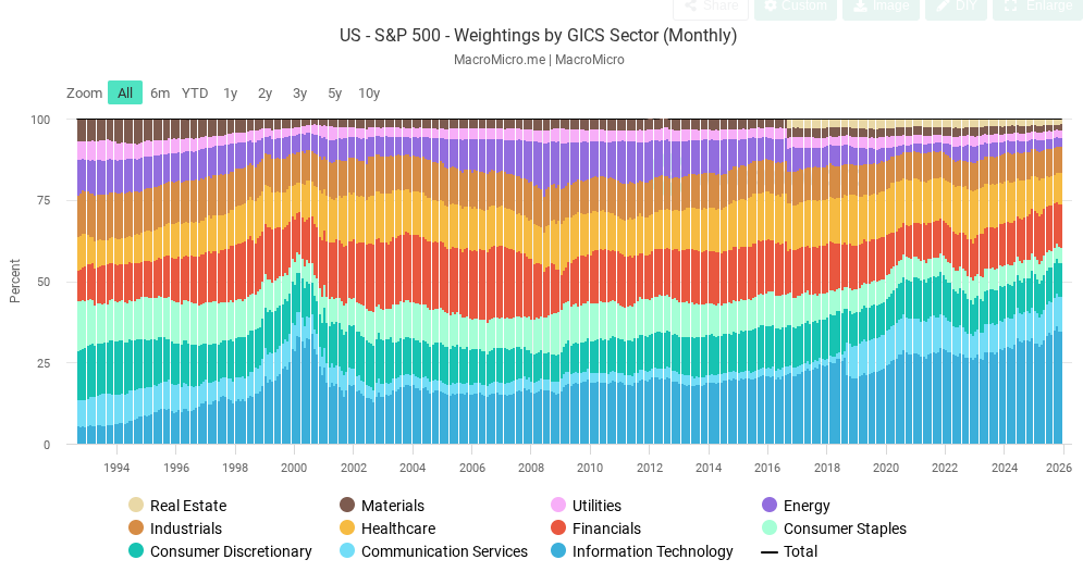I’ll get to both points in a moment. But first have a look at the chart at the top of this week’s research note. It shows the weightings of all eleven S&P sectors going back to 1992. The little purple wedge, three down from the top, is the energy sector. It was 9.74% of the S&P 500 in 1992. When the oil price peaked before the 2008 crash, the energy sector was 16.2% of the S&P 500.