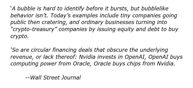 I have no issue with the general thesis that we are due for a market correction. Well overdue in fact. From my economics class instruction from my High School days (over fifty years ago), we were instructed that economic cycles generally run in eleven to thirteen year increments - so yeah, a correction from the low of 2008 to this current high in 2025 is a foregone conclusion. Better to ask why it hasn't occurred to date. Prolific money printing by the Fed, I suspect.