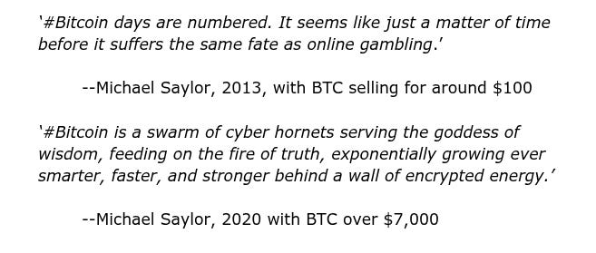 This experience might have induced a lesser man to go straight. But Saylor kept at it. He had bought up some domain names — such as Angel.com, Wisdom.com and Voice.com — which he was later able to sell at a profit. Then, with the price of bitcoin around $8,000...he became over-enthusiastic.