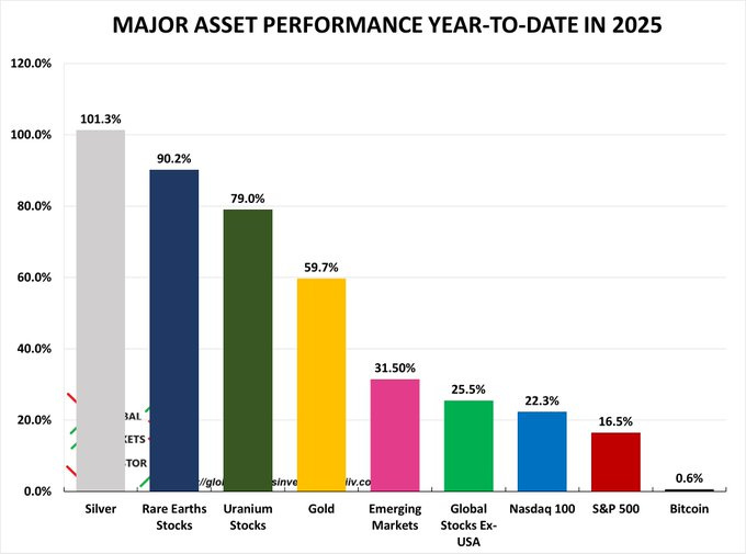 It’s been anything but quiet for precious metals this year. Gold is up 66% year-to-date and has made 51 new all-time highs. Silver is 131% and has made 14 new all-time highs. The chart above (from earlier this week) tells the tale for 2025.
