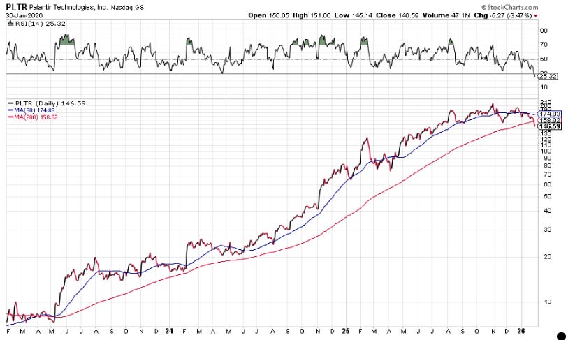Markets are always discounting different versions of the future. Narratives compete for investor buy-in. There will be a point when investors realize the huge investment in AI is the largest mis-allocation of capital in recent history…and re-price the ‘hyperscalers’ and Palantir accordingly. The valuations suggest it is inevitable. But is it imminent?