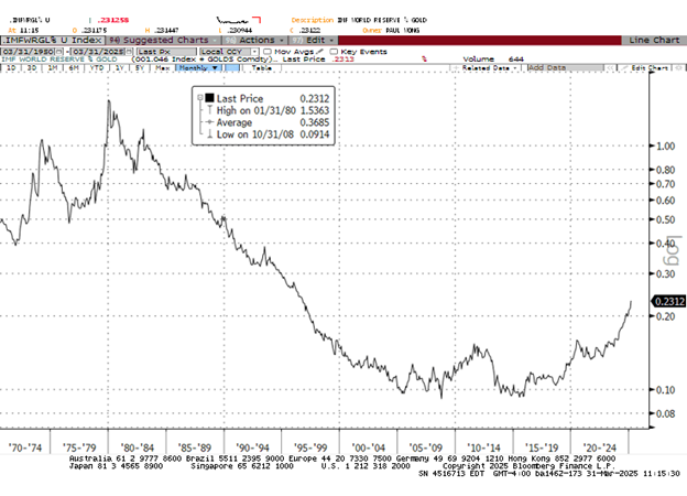 Source: Bloomberg monthly chart of percentage IMF World Reserve holdings of gold, as of 03/31/2025.