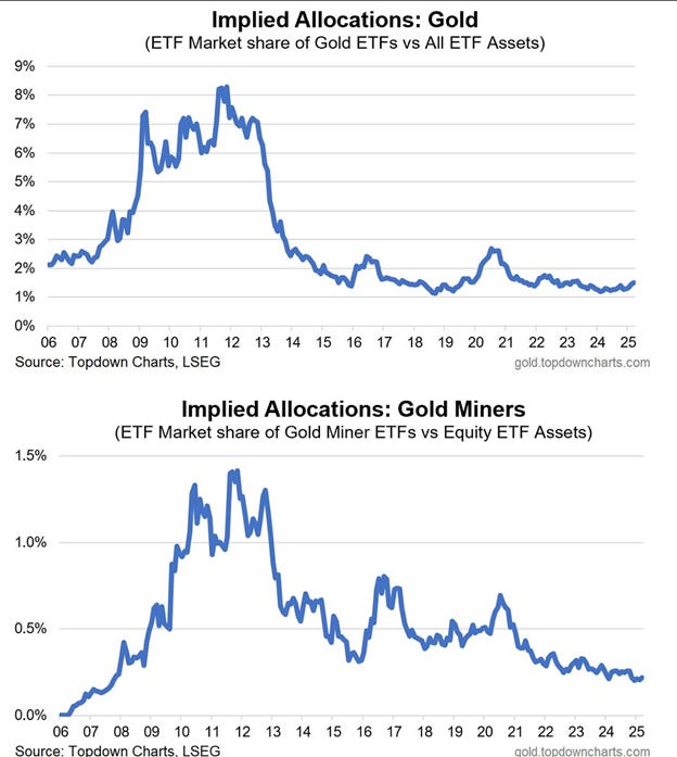 Gold still only represents a tiny fraction of the global financial system. Physical Gold ETFs account for barely 1% of all ETFs. Gold mining equity ETFs account for even less of all equity ETFs.