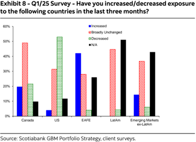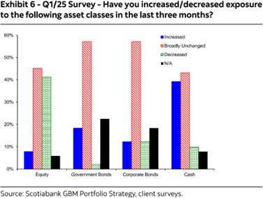 The Magnificent 7 dominate even some of the biggest foreign national banks. So, in effect, the S&P500 trade may have become a global reserve asset. Scotiabank recently published a survey of over fifty of their institutional clients. Granted, these are just a snapshot in time, during an especially volatile period, but it does help highlight current sentiment.