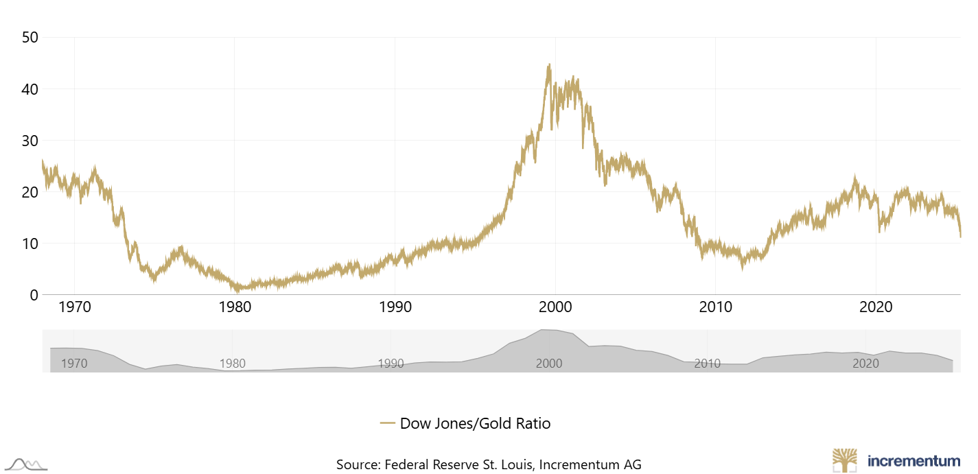 But given historical peaks and troughs, I think there could be yet another shoe to drop before gold might be considered overvalued relative to the Dow.