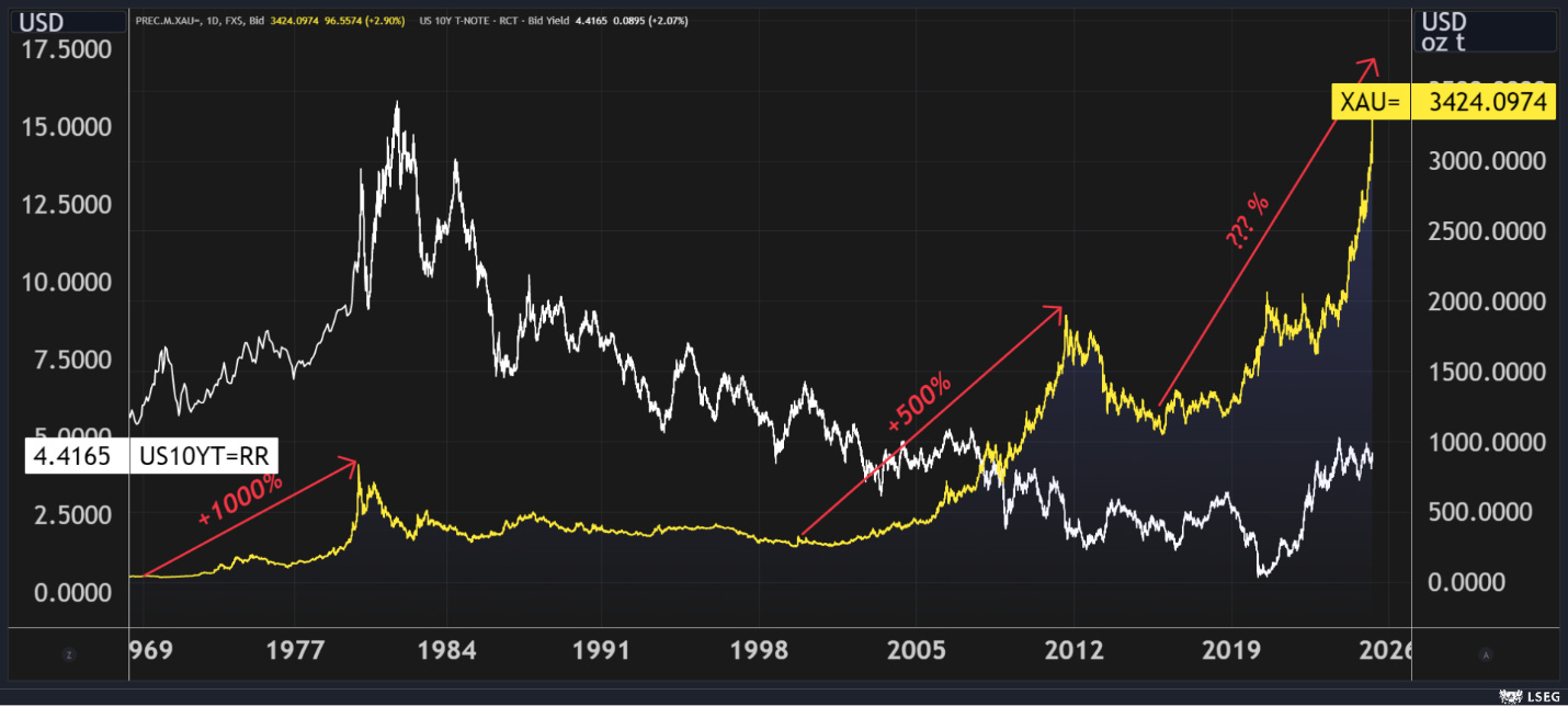 Source: LSEG daily chart from 1969 to 2025 showing gold price (XAU: yellow) performance relative to US 10-Year Treasury Note (white).
