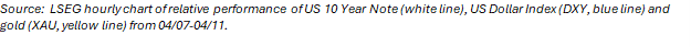 It’s quite possible something like this actually happened. The US 10Y Treasury Note Yield (“10Y bond) shot up over 10% (white line on the chart below) in the week following Trump’s announcement, indicating someone was selling the 10Y bond.