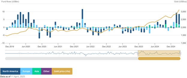 And recently, gold ETF flows (indicating retail interest) have started perking up, as reported by the World Gold Council in the chart below as of April 11th. Notably, US retail investors are getting back in… Worth pointing out that China has also had large flows, especially in April which accounted for over half of their YTD flows (YTD, nearly 30% of AUM).