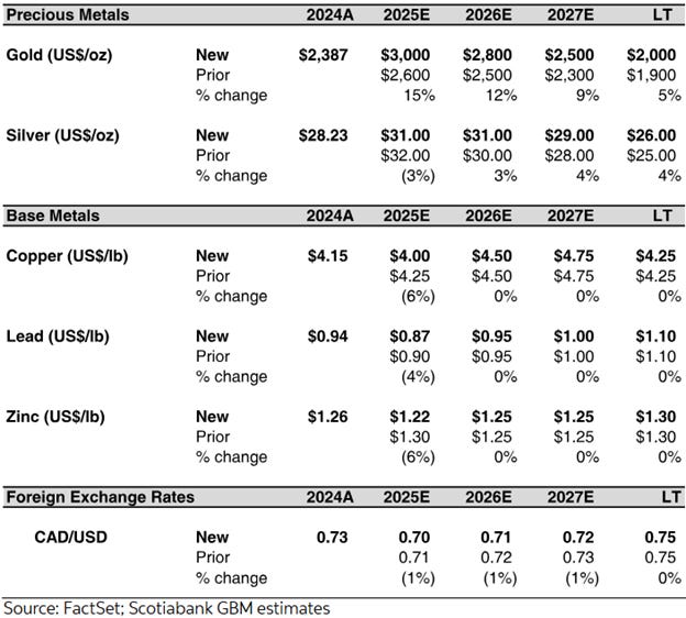 Interestingly, Scotiabank just updated their gold and silver price deck earlier this week (snapshot below): $3,000/oz, $2,800/oz and $2,500/oz (from $2,600/oz, $2,500/oz and $2,300/oz) for 2025, 2026 and 2027. Long-term (2028+) the price assumption is for gold at $2,000/oz from $1,900/oz in prior assumptions.