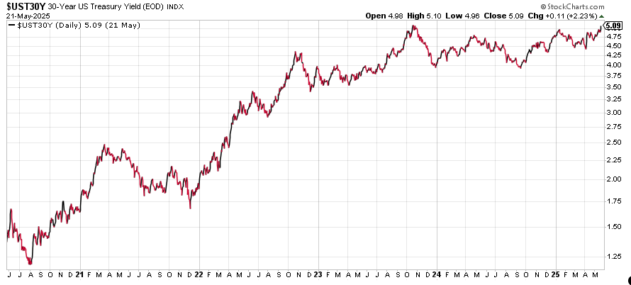 Don’t look now, but 30-year US bond yields are back over 5%. There’s nothing magical about this level. But in the past five years, it’s seemed to be a ‘pain point’ for holders of 10-year US Treasury bonds (where the yield is around 4.6% at the moment).