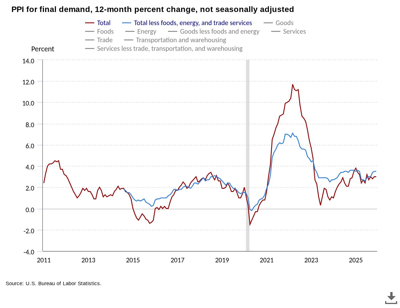 On a year-over-year basis, the Producer Price Index (PPI) increased 3.0% compared to December 2024, holding steady from the prior month but coming in above forecasts of +2.7%. Core PPI (excluding food, energy, and often trade services in some measures) rose 0.7% month-over-month and accelerated to 3.3% year-over-year from 3.1% previously. This ‘hot’ inflation data comes as President Trump nominates Kevin Warsh to be the next Chairman of the Federal Reserve. Inflation remains a serious problem.