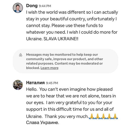 “It’s a way to support Ukrainians. You book a stay in one of their private listings... a day, a week... whatever. Obviously you don’t actually check-in or anything. But all the money goes directly to the host just the same. Airbnb has even waived its fees and charges. And they have verified ‘superhosts,’ who have been around a while, to help ensure the account owners really are who they say they are...”