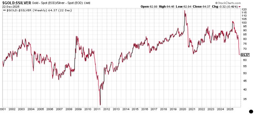 It’s also the end of the year. Which means a lot of institutional investors may be doing some ‘window dressing’ and adding precious metals to their portfolio to show they own them (bad form to not own some of the best-performing assets of the year). The gold/silver ratio (see above) suggests something big has happened/is happening.