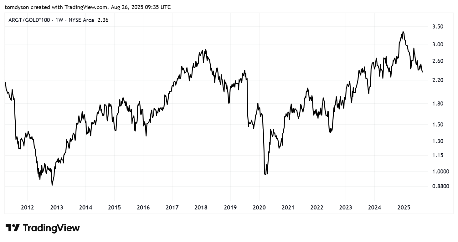 Here’s a chart of the Argentina ETF [ARGT] priced in gold over the last fifteen years. Milei took over on December 10, 2023 and Argentina stocks have done okay since.