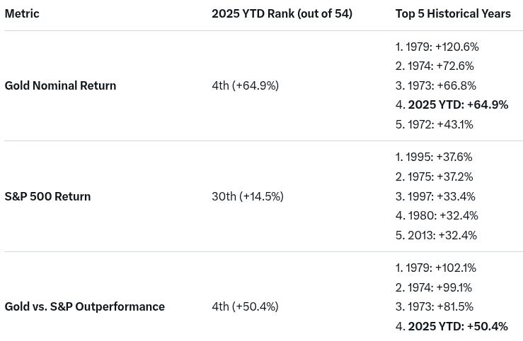 From a strict numbers point of view, the 5.7% one day fall in gold (8.7% for silver) was the biggest drop since 2013. Keep in mind this came after a nearly 60% year-to-date rise for gold. Some profit taking (rather than distressed selling) was in order after such a strong performance (in nominal terms AND against the S&P 500). See the numbers below that put gold’s year-to-date performance in historical context.