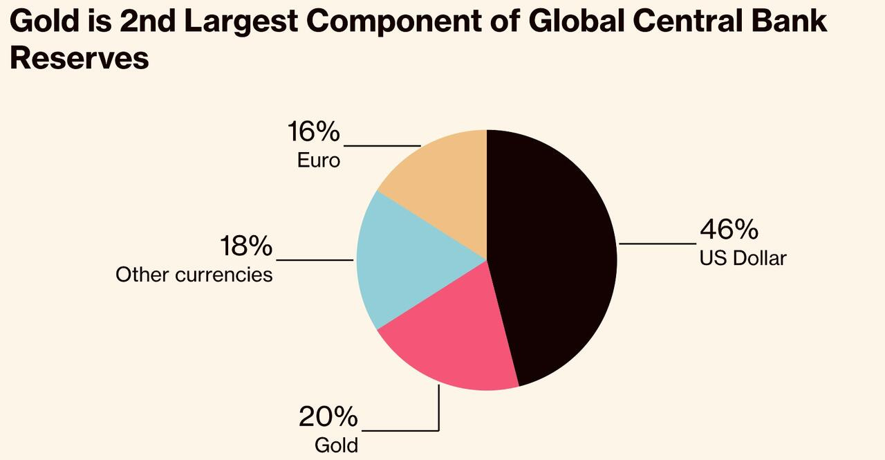 You could have had an ounce of gold for $1,991/ounce in mid-February 2024. It’s up 73% since then, and 44% in the last year. That gain is down mostly to central bank buying, which you can see in the chart above. Gold has now replaced the Euro and ‘Other’ currencies as the second largest component of central bank reserves, according to Bloomberg.
