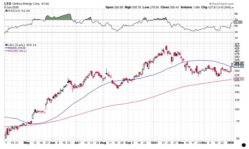 One of the companies in line for government money is Centrus Energy (pictured above, after rising more than 9% yesterday). BPR wrote about Centrus and other companies involved in the nuclear supply chain in late 2022 and again in 2023. What’s changed since then?