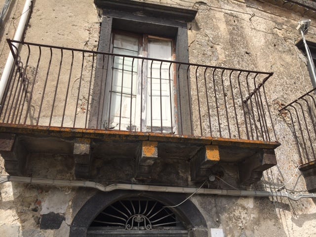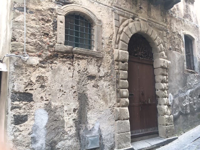 The former aroused our curiosity as we drove through the lava fields around Mount Etna. There it was, on the top of a hill…far above the grape vineyards and wine groves below. And when we looked it up on the internet, we discovered that it was offering free houses. So, we decided to see for ourselves.