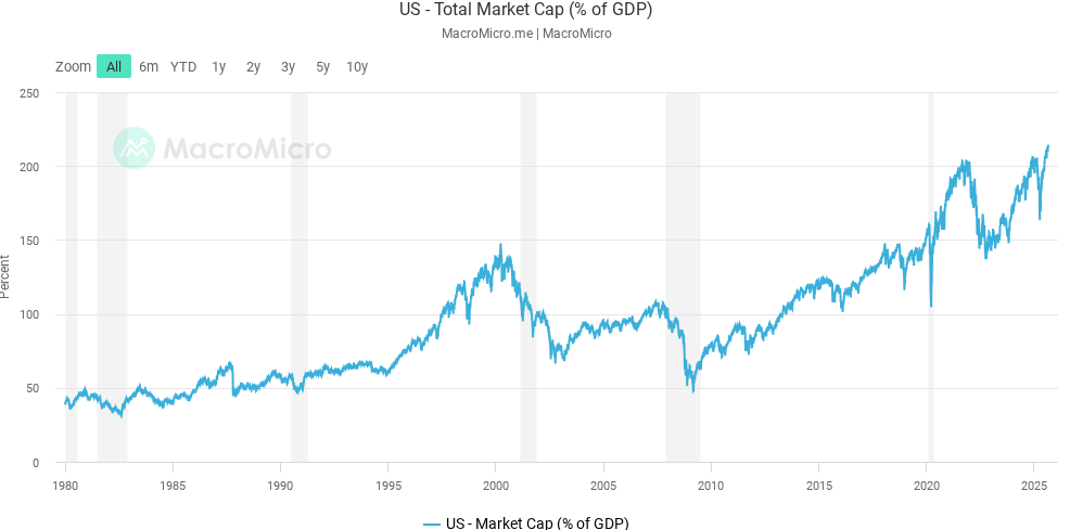 The chart above shows US stocks have never been worth more relative to the economy. The market-cap-to-GDP ratio, sometimes called ‘The Buffett Indicator’ after Warren Buffett, is nearing 215%. It’s historic average is around 86% (I’ve been following this one indicator for almost thirty years now). When it returns to that average, as it almost certainly will, stocks will fall like a stone.