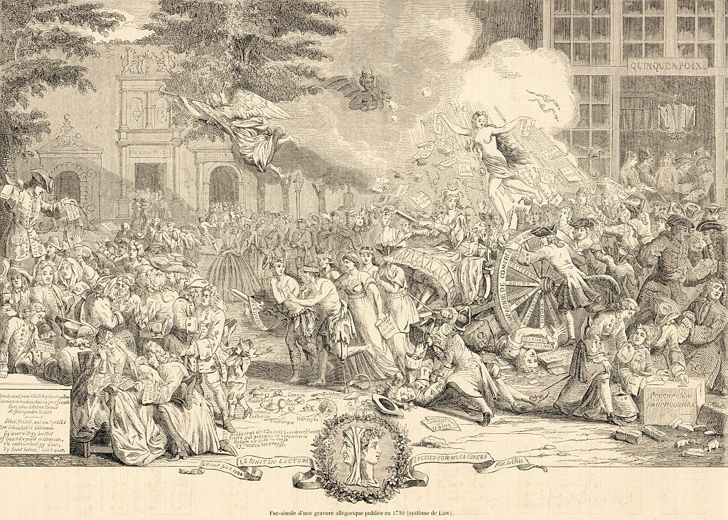 Engraving depicting the Mississippi Bubble in France in 1720, widely considered by historians to be the first (or greatest) stock market mania fueled by government money printing. Source: Getty Images