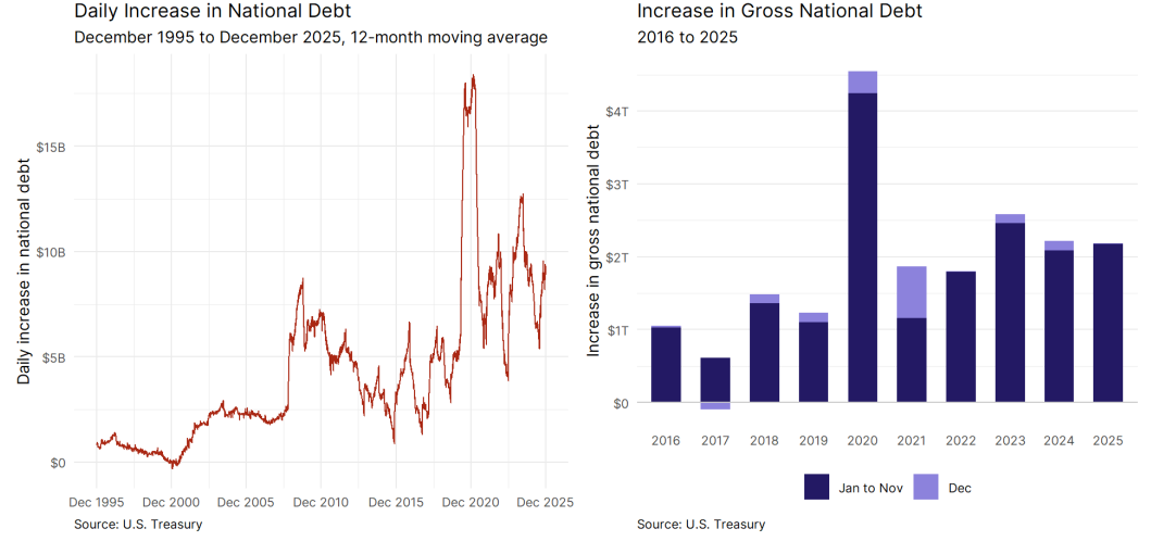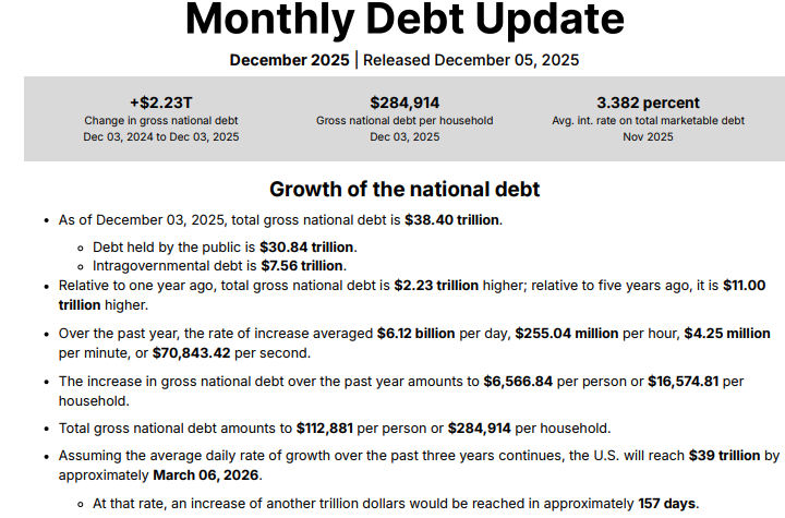 US government debt grew by over $70,000 per second in 2025. At the current rate, according to the Joint Economic Committee of Congress, the national debt will hit $39 trillion by March 06, 2026—just 63 days from now. The next trillion dollars in debt, bringing the total to $40 trillion, would be added 157 days later (Monday, August 10th).