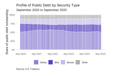 The Bureau of the Fiscal Service publishes an annual version of this chart next week. I’ve been following it for years and will have an update for paying subscribers when it comes out. It’s an early warning sign for when the government (and the bond market) might run into more trouble. The general trend in this century is that various administrations have borrowed more money at shorter terms because the interest rates are lower (and the Federal Reserve has ‘pushed down’ the short end of the interest rate curve by keeping interest rates artificially low for excessively long).