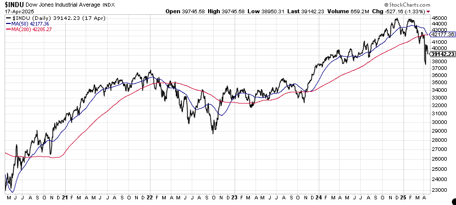 If politics haven’t taken a pause to collect their thoughts for the Easter weekend, markets have. You can see from the chart above that the Dow Jones Industrials is poised at the so-called ‘death cross’ where the short-term moving average has crossed below the long-term moving average in a bearish technical signal (perhaps a bit on the nose for Good Friday, but it is what it is).