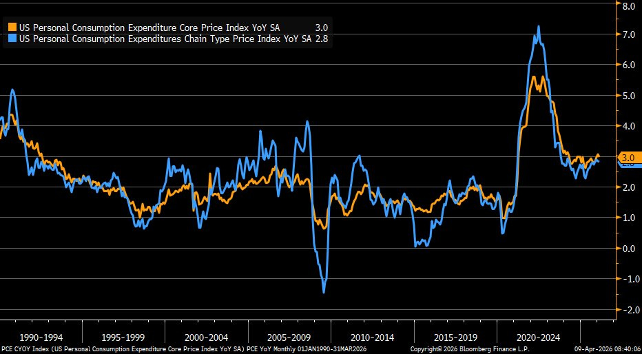 The Consumer Price Index (CPI) was up 3.3% in March, compared to 2.4% in February. Rising consumer prices have only partly captured surging global energy prices. Yesterday, the Personal Consumption Expenditure figures from March showed prices rising 3% year-over-year (see chart above). ‘Core’ PCE is said to be the Fed’s preferred measure of inflation in the US economy. The PCE numbers are from February and don’t include any rising prices for goods and services connected to the war in Iran and higher energy prices.