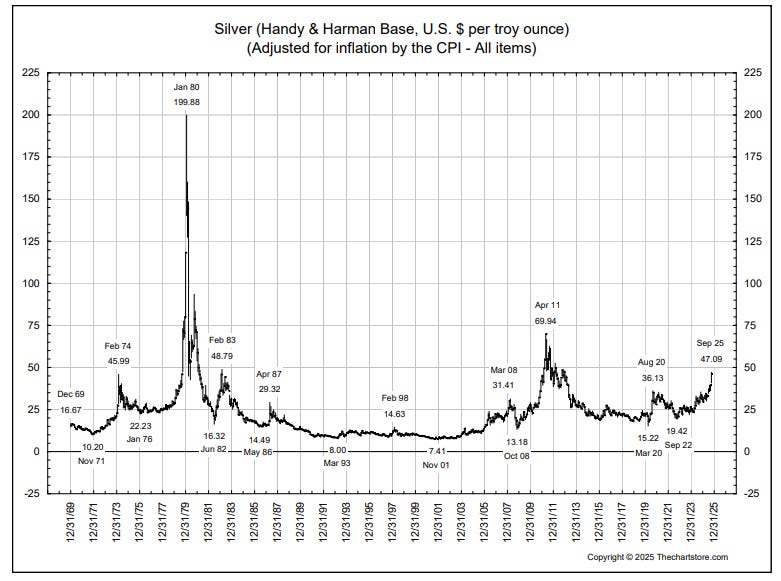 The chart above shows the silver price adjusted for inflation (using CPI as the deflator). By that methodology, the 1980 inflation adjusted silver price is just shy of $200, or 300% higher from here. Silver futures are up 69% year-to-date.