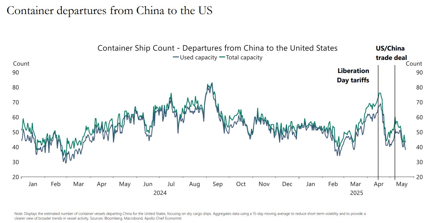 This chart shows containership departures from China to the US. If we disregard recent disruption to the data caused by Trump’s tariff indecision, the number of container ship sailings has been falling since last September…and looks to be heading to new lows. August and September is the traditional peak season for the container shipping trade between China and the US as retailers stock up for back-to-school sales, Halloween, Thanksgiving and Christmas. Will containership departures recover soon? Or will we get another supply shock later this year? We’ll see. We’ll be monitoring this data, as well as the number of containers moving through the Port of LA each week, in our paid newsletter.