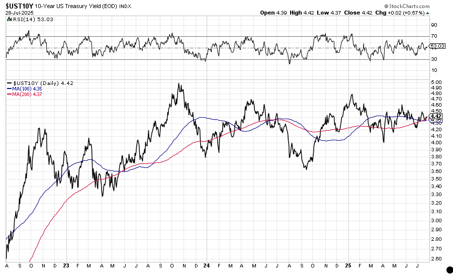 Tomorrow we’ll learn the mix of the scheduled borrowing…bills, bonds, and notes. All eyes will be on the most important price in markets, the 10-year US government bond yield. So far, Treasury Secretary Scott Bessent has succeeded in keeping the 10-year from reaching 5%. That’s a kind of ‘red line’ in markets that triggers all sorts of other stresses—including in stocks. Stay tuned.