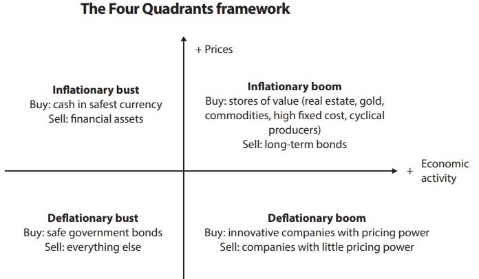 I love this macro framework created by the investment legend Charles Gave in the 1970s. All our work indicates that we are now in the top right quadrant, labelled ‘inflationary boom.’ The Bonner Private Research investment strategy holds lots of precious metals, cash and critical hard assets that pay dividends. We don’t own any long-term bonds or major stock market indices.