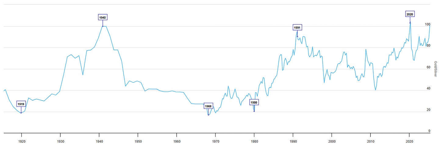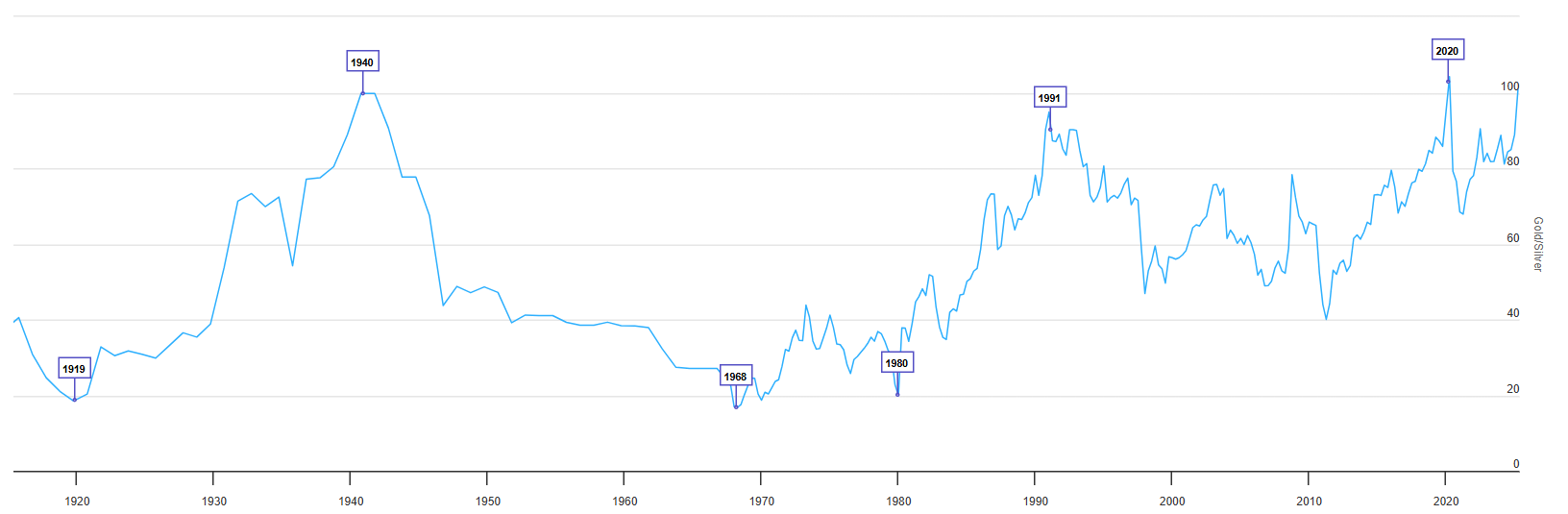 Here’s a long term chart of the Gold/Silver ratio. The Gold/Silver ratio has hit 100:1 on three prior occasions over the last century...and it was never sustained.