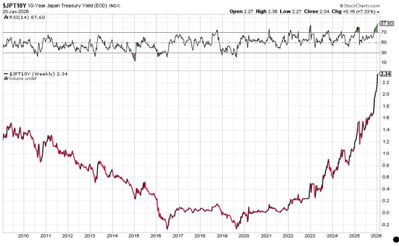 Japan’s 10-year bond yield has gone ‘parabolic’ in recent trading, reaching a mutli-decade high of 2.34%. Is the global government debt bubble bursting, driving bond yields higher and spurring even more accumulation of safe haven assets like gold?