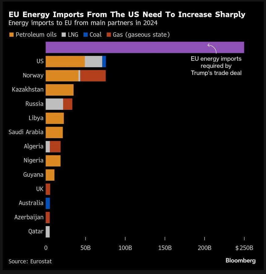 ‘The $250 billion purchase of US energy the Europeans just agreed to is pure fantasy. The US is already Europe’s largest supplier. In 2024, Europe spent less than $100 billion on US energy. Where is the additional $150 billion going to come from?