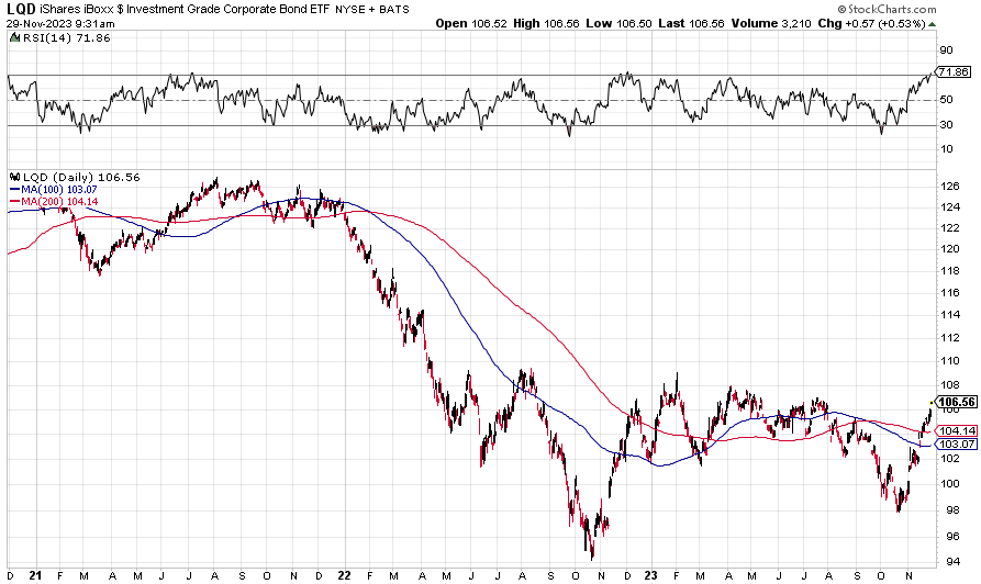 Bond traders take note. Today's GDP revision has the economy growing at 5.2% in Q3 vs. the previously reported 4.9%. Consumer spending was revised down from 4% to 3.6%. Government spending was revised up from 4.6% to 5.5%. And business investment was revised up from 0.8% to 2.4%. On a Relative Strength Basis (RSI), an ETF that tracks corporate bonds (LQD, see below) looks overbought. If interest rate cuts are not imminent, lower bond prices probably are.
