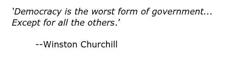 In the meantime, Churchill, quoted above, may be right. Democracy may be the best we can do. We’ve never tried the ‘others’ so we don’t know.