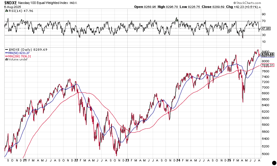 Speaking of ‘the Generals,’ Investment Director Tom Dyson published a chart in his weekly Market Note (Strong Shipping Uptrend) to paying subscribers showing that net income growth among the Mag 7 has likely peaked for this cycle. This got our research department in Laramie wondering what the equal weight Nasdaq 100 looks like at the moment. See the chart above.