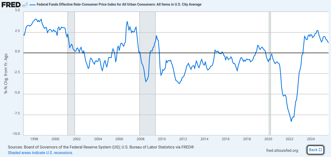 ‘Real’ rates started heading lower in August of last year. This is a combination of Fed rate cuts AND higher inflation. Now, if the Fed cuts rates next week (as is widely expected) and inflation is higher than reported/expected (due to rising winter energy costs in the CPI), you can expect lower ‘real’ rates as we head into 2026.