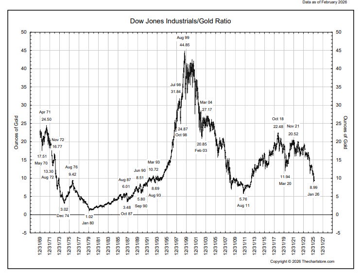 And included in the long upward march of stock prices are decades when stock prices go down. Or nowhere. Adjusted for inflation, stock prices went down for the entire decade of the ‘70s. And adjusted to gold, they’ve been going down for the last 26 years.