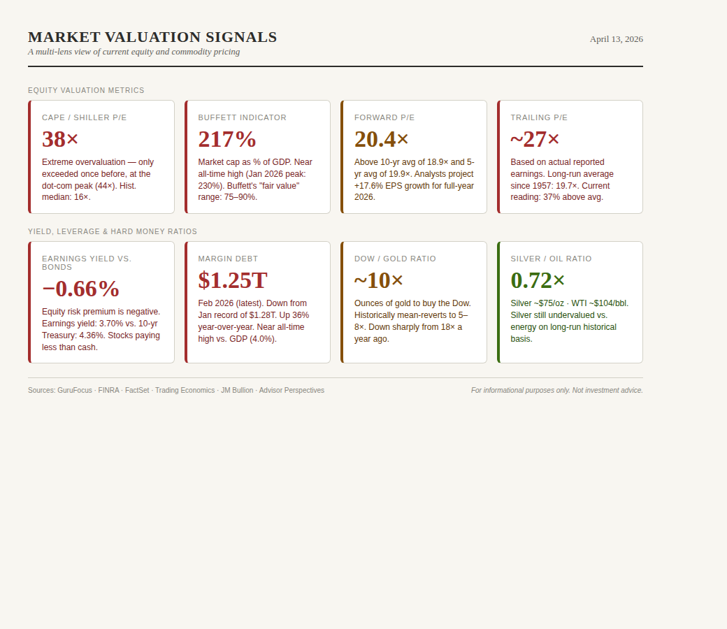 BPR is experimenting with some new dashboards that focus on market data, stock screens, and key ratios. Above, some of the traditional valuation metrics we track and report on regularly: the Cyclically Adjusted Price Earnings (CAPE) ratio, the market-cap-to-GDP ratio, the Dow/Gold ratio and more. Leave a comment for ratios or stock screens you’d be interested in regular reporting on.