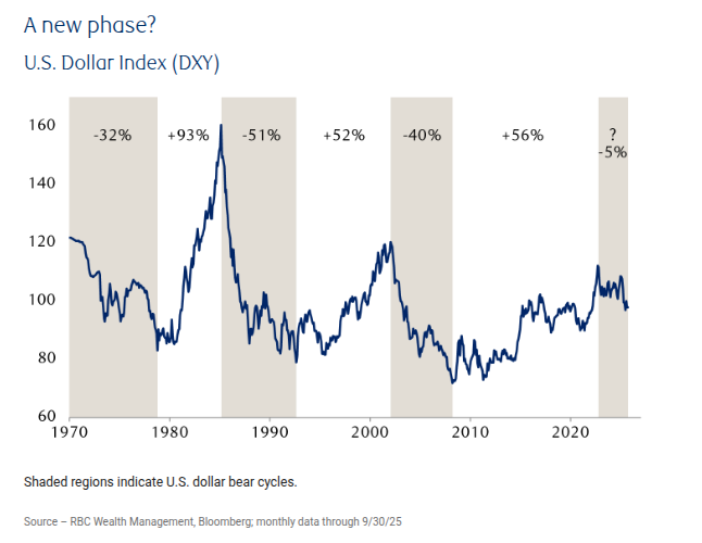 The DXY moves in seven to ten year cycles, according to a research report published last month by RBC Wealth Management. Average gains are around 65% in the up cycles. Losses are around 40% in the down cycles, according to the research. A DXY down cycle looks to have begun in 2022.